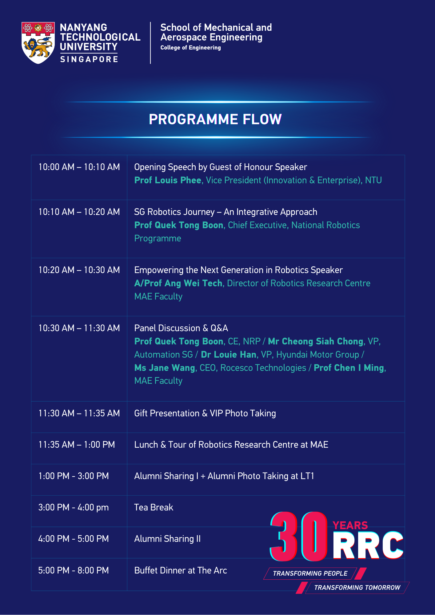 Join us in celebrating the 30th Anniversary of the Robotics Research Centre (RRC) at Nanyang Technological University (NTU). This milestone event will showcase three decades of innovation and advancement in robotics and automation, featuring insightful talks, engaging discussions, and networking opportunities.